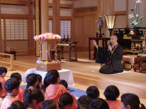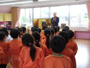 毎週水曜日のお参りの時間に、子どもたちが理事長のお話を聞きます。