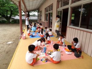 普段は給食を食べている子ども達ですが、今日はおうちから持ってきたお弁当を外で食べました🍱