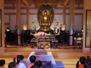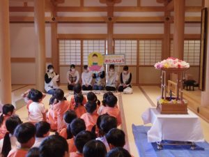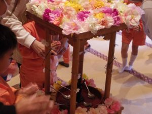 子ども達は花まつりの歌を歌ったり、誕生仏(お釈迦様の生まれたときの仏像)に甘茶をかけてお参りしました。