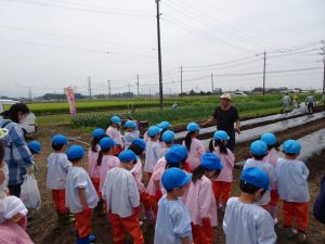年長組の子ども達が園外保育でさつま芋の苗植え体験に行きました。