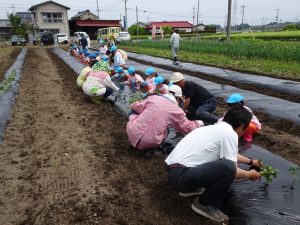 スーさんファームの坂入さんや農協の職員の方から苗の植え方を教えてもらいながら、大きいなお芋になりますようにと苗を上手に植えることが出来ました!